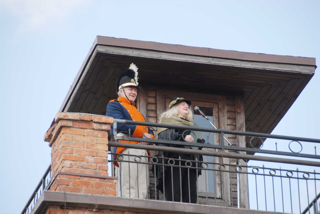 Se­na­ja­me gais­ri­nin­kų bokš­te bu­vo iš­kel­ta kul­tū­ros vė­lia­va. Iš aukš­ty­bių į su­si­rin­ku­siuo­sius krei­pė­si į Gra­fie­nės vaid­me­nį įsi­kū­ni­ju­si bib­lio­te­kos di­rek­to­rė Ra­sa Griš­ke­vi­čie­nė ir jos ad­ju­tan­tas – sa­vi­val­dy­bės Kul­tū­ros sky­riaus ve­dė­jas Ju­lius Za­rec­kas. Jie­du pa­skel­bė ge­riau­sių­jų ti­tu­lus pel­niusius kul­tū­ros dar­buo­to­jus ir pa­kvie­tė juos ap­do­va­no­ji­mus at­si­im­ti bokš­te.