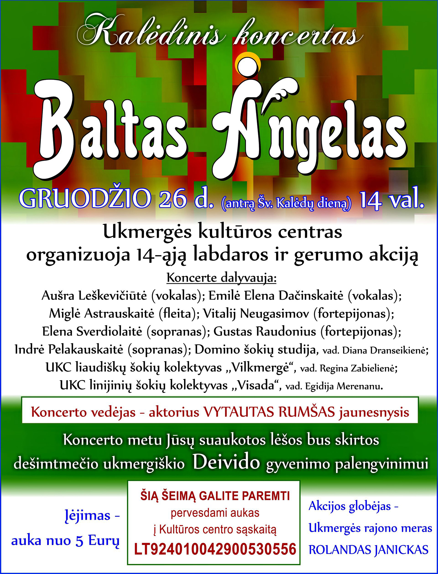 Kultūros centro, kaimo skyrių ir meno saviraiškos kolektyvų nariai jau renka lėšas. Prisidėkite ir Jūs, pervesdami piniginę auką į Ukmergės kultūros centro sąskaitą LT924010042900530556 arba pirkite bilietus į kalėdinį labdaros ir paramos koncertą „Baltas angelas“, kuris įvyks gruodžio 26 d. 14 val.