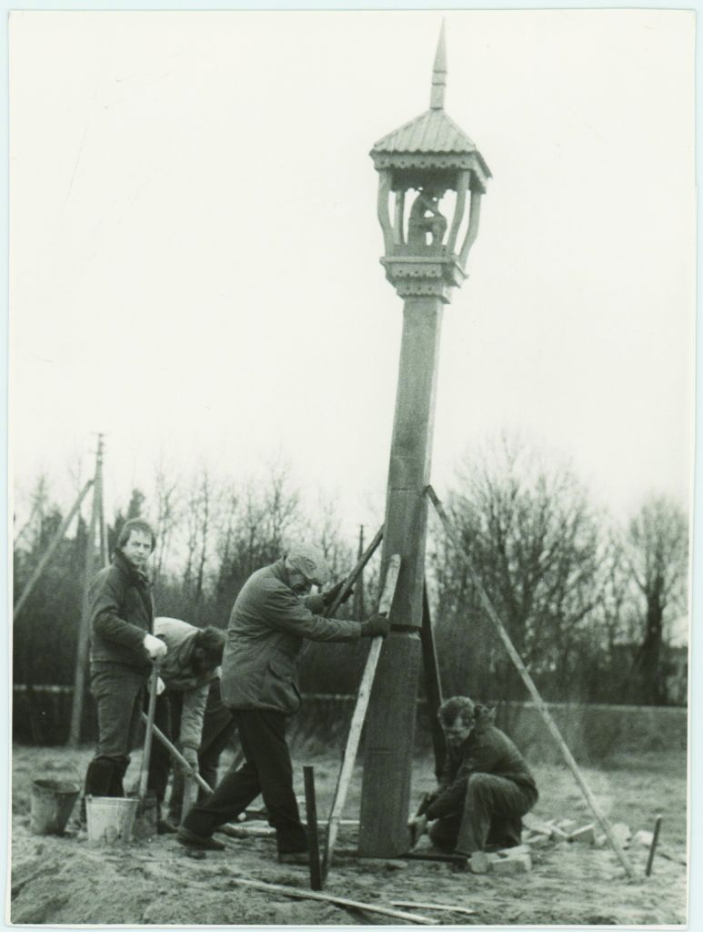 Ukmergės kraštotyros muziejaus fonduose saugoma fotografija, kurioje užfiksuotos koplytstulpio, skirto P. Galaunės 100-ųjų gimimo metinių proga, pastatymas.