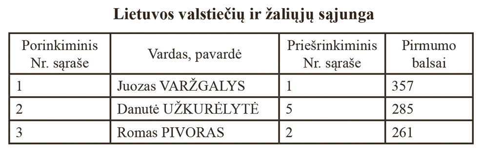 Lietuvos valstiečių ir žaliųjų sąjunga su 11,38 proc. palaikymu turės 3 vietas. Prarado taip pat vieną mandatą.