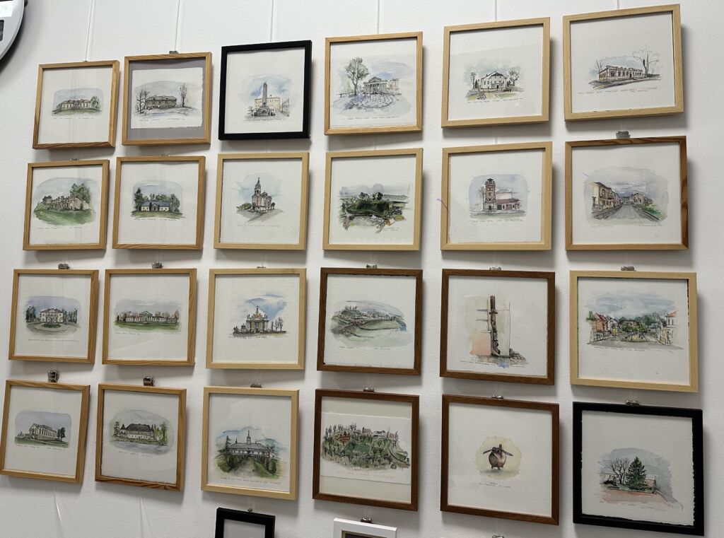 Tai – piešinių serija, atlikta akvarelės ir tušo technika, susidedanti iš aštuonių lankytojams atvirų dvarų Ukmergės rajone. To paties užsakymo antroji dalis – sukurti Ukmergės dvarų žiedo žemėlapį. Man svarbiausia buvo sukurti nostalgišką nuotaiką ir tiksliai piešinyje perteikti architektūrinius elementus ir detales. Kiekvieną dvarą įsivaizdavau lyg atskirą personažą, turintį savo charakterį. Jį atskleisti pasitelkiau skirtingus metų laikus, spalvas ir gamtinius elementus. Visą 30 akvarelių miniatiūrų kolekciją galima pamatyti UKC galerijoje, kabančią prie šoninio išėjimo į terasą, o turizmo centre kviečiu įsigyti šių paveikslėlių kopijų ir magnetukų.