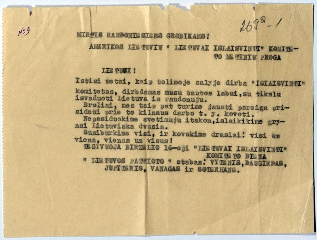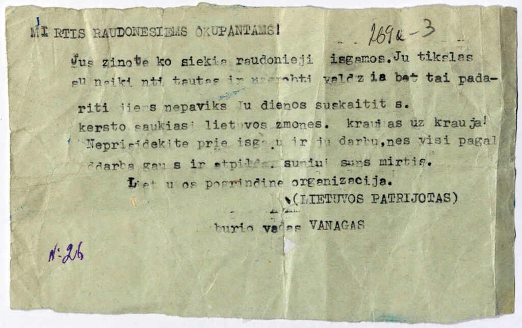 Pogrindžio jaunimo organizacijos „Lietuvos patriotas“ štabo narių pasirašytas atsišaukimas. 1951 m. Nuotraukos iš Lietuvos ypatingojo archyvo dokumentų