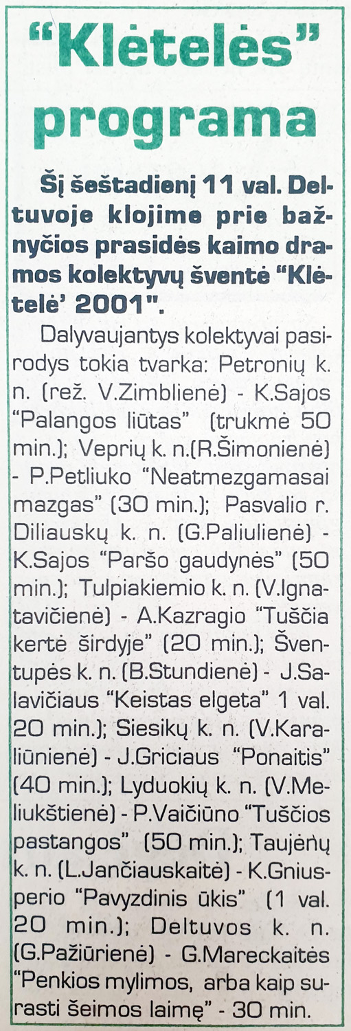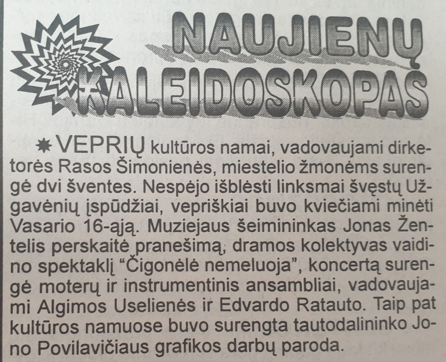 Kitais metais kolektyvas pasirodė Vepriuose, minint Vasario 16-ąją. Šventės metu vaidino spektaklį „Čigonėlė nemeluoja“ (Gimtoji žemė, 2002-02-21, Nr. 22).