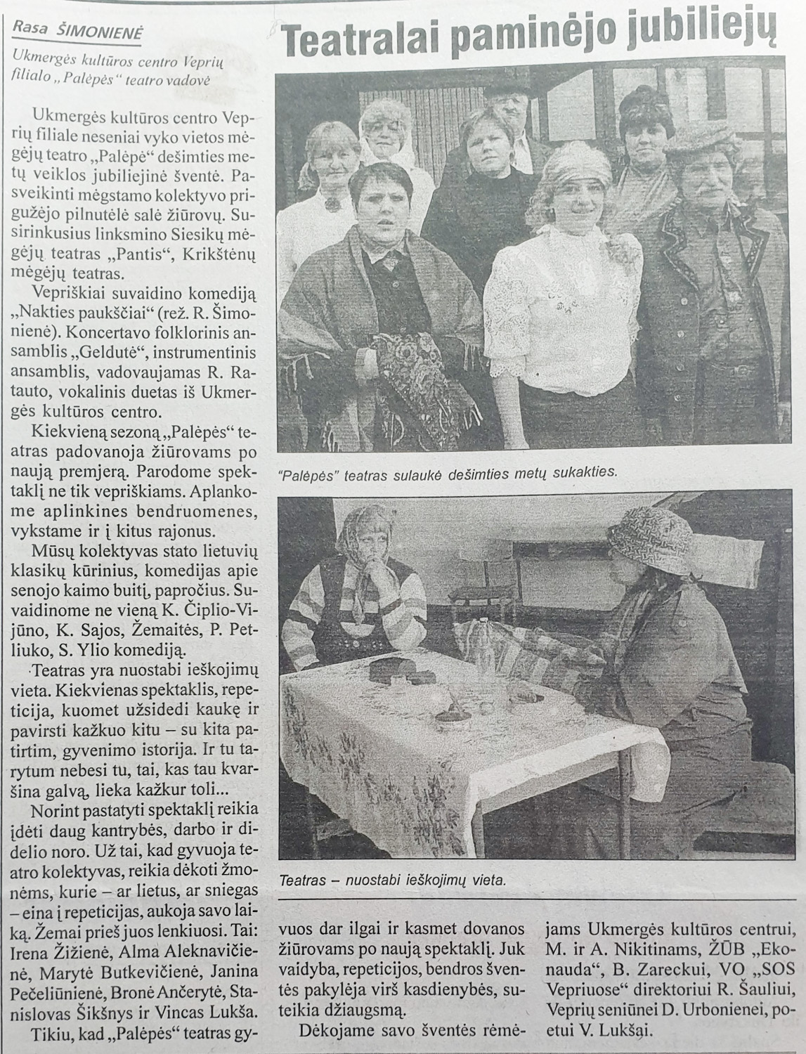 Po renginio išėjo ir platesnė publikacija, iš kurios daugiau sužinome apie to meto „Palėpės“ veiklą (Šimonienė Rasa. Teatralai paminėjo jubiliejų, Ukmergės žinios, 2009-10-30, Nr. 83). Savo šventėje vepriškiai vaidino komediją „Nakties paukščiai“. Publikacijoje rašyta, kad teatras po premjerą pristatydavo kiekvieną sezoną. Spektaklius rodydavo rajone, vykdavo į kitus rajonus.