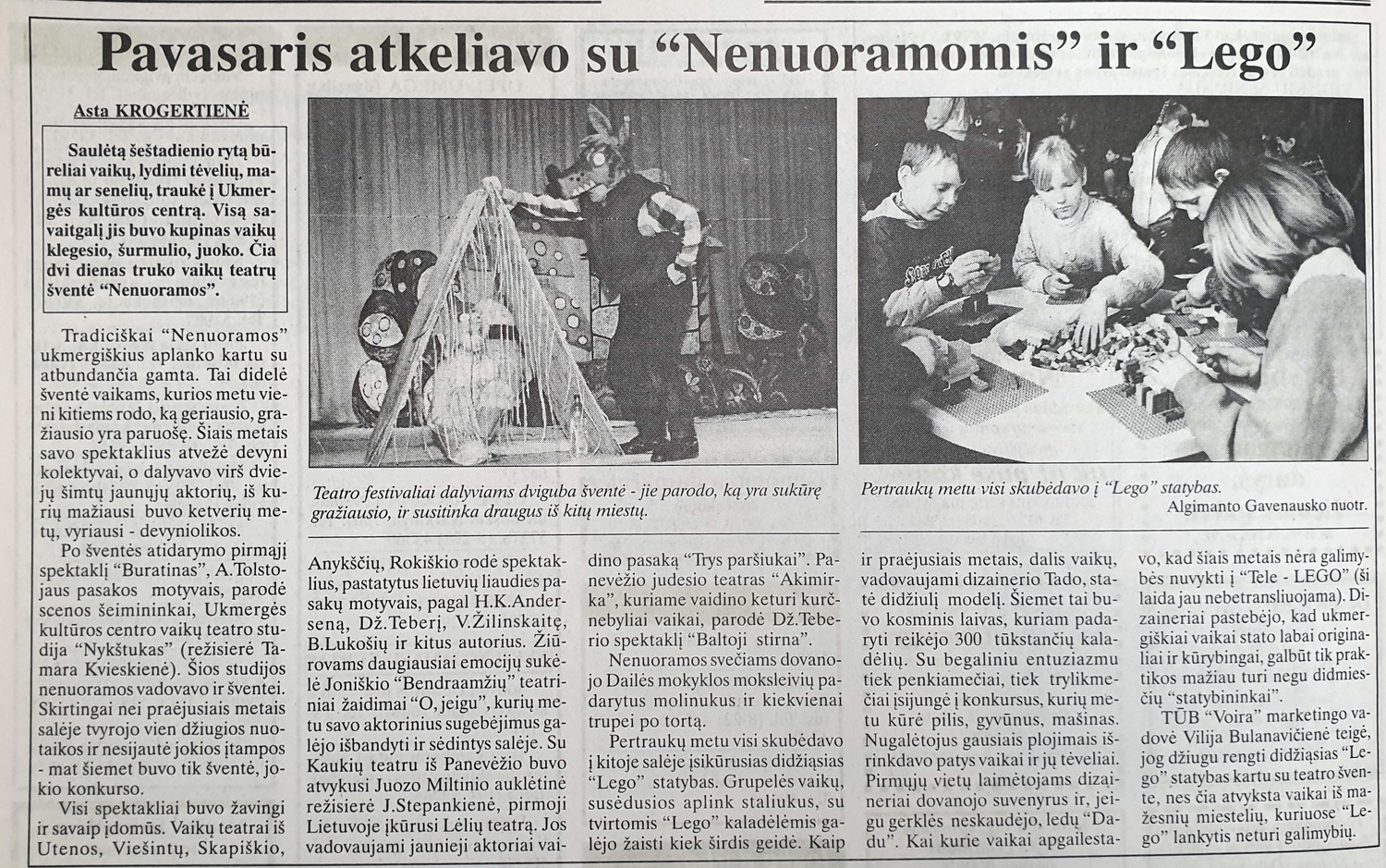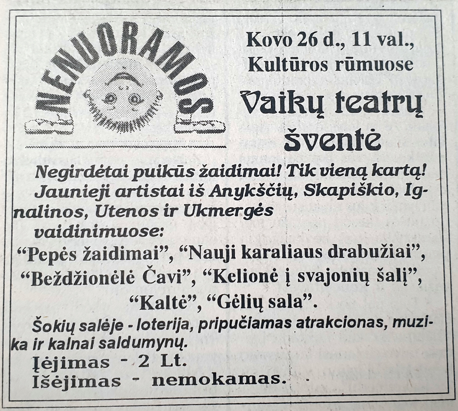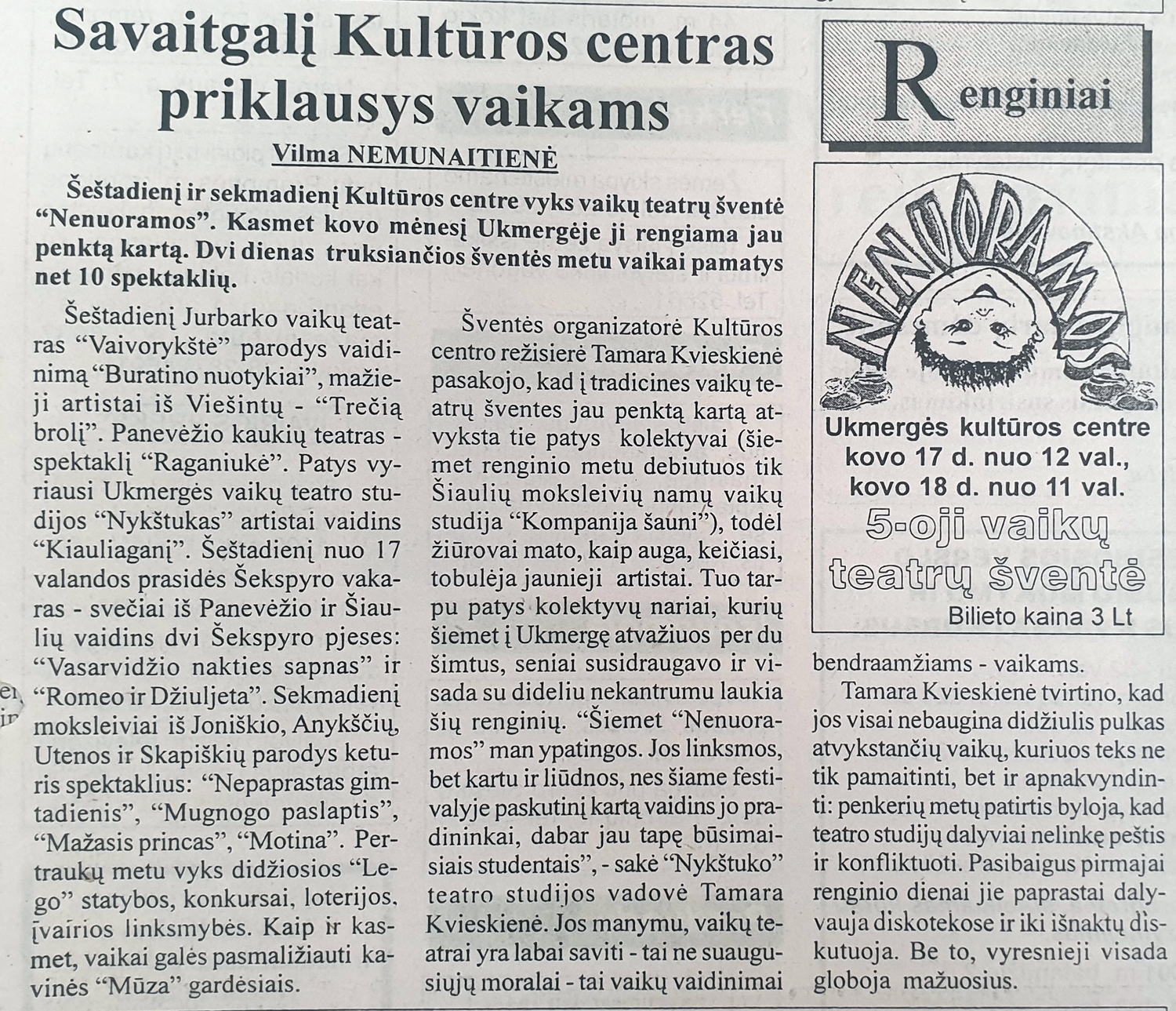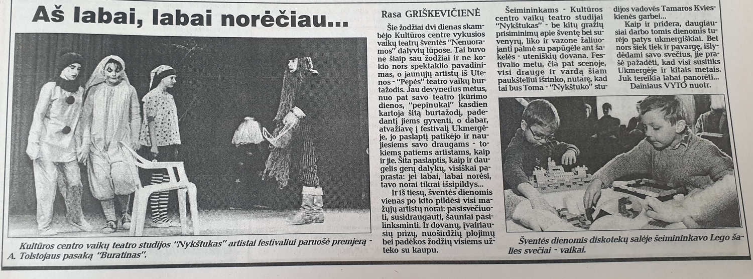 Šiųmetės šventės planais dar pasidalinsime, o kol kas apžvelkime, ką apie „Nenuoramas“ rašė spauda pirmaisiais šventės metais ir kaip gimė šis vaikų ir jaunimo teatrų festivalis Ukmergėje.