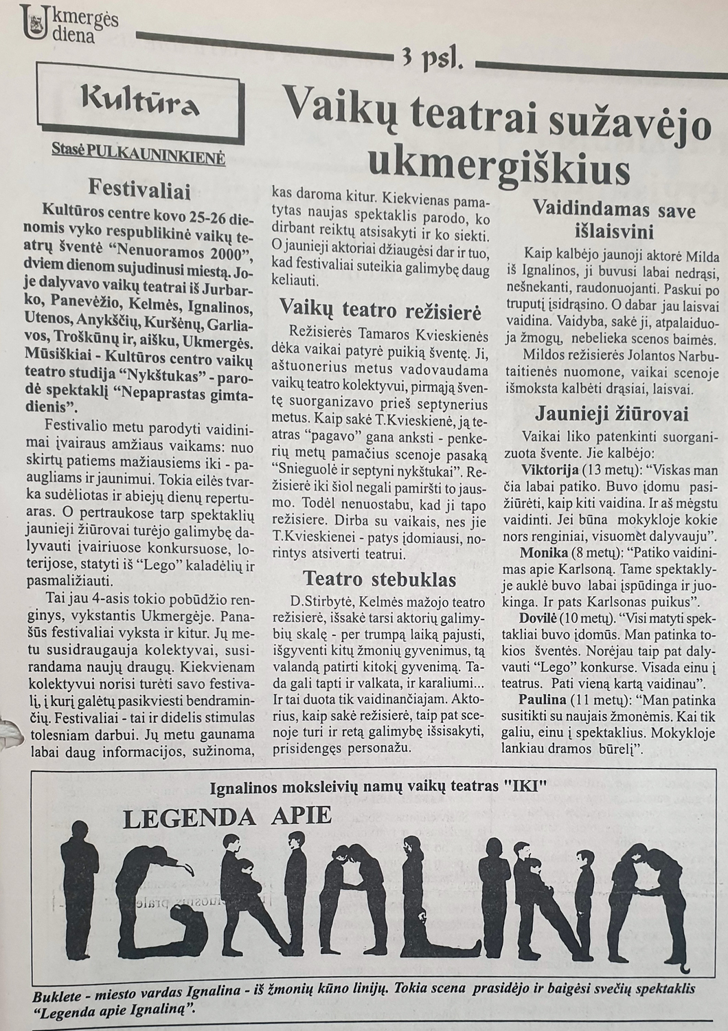 Publikacijoje pateiktos kolektyvų režisierių ir jaunųjų aktorių įžvalgos apie tai, ką žmogui suteikia teatras – aktoriai turi galimybę scenoje patirti kito žmogaus gyvenimą, išsisakyti, prisidengus personažu, vaidyba atpalaiduoja, leidžia peržengti baimes, vaikai išmoksta kalbėti drąsiai, laisvai (Pulkauninkienė Stasė. Vaikų teatrai sužavėjo ukmergiškius, Ukmergės diena, 2000-03-28, Nr. 36). Pateiktos ir žiūrovų mintys apie matytus spektaklius.