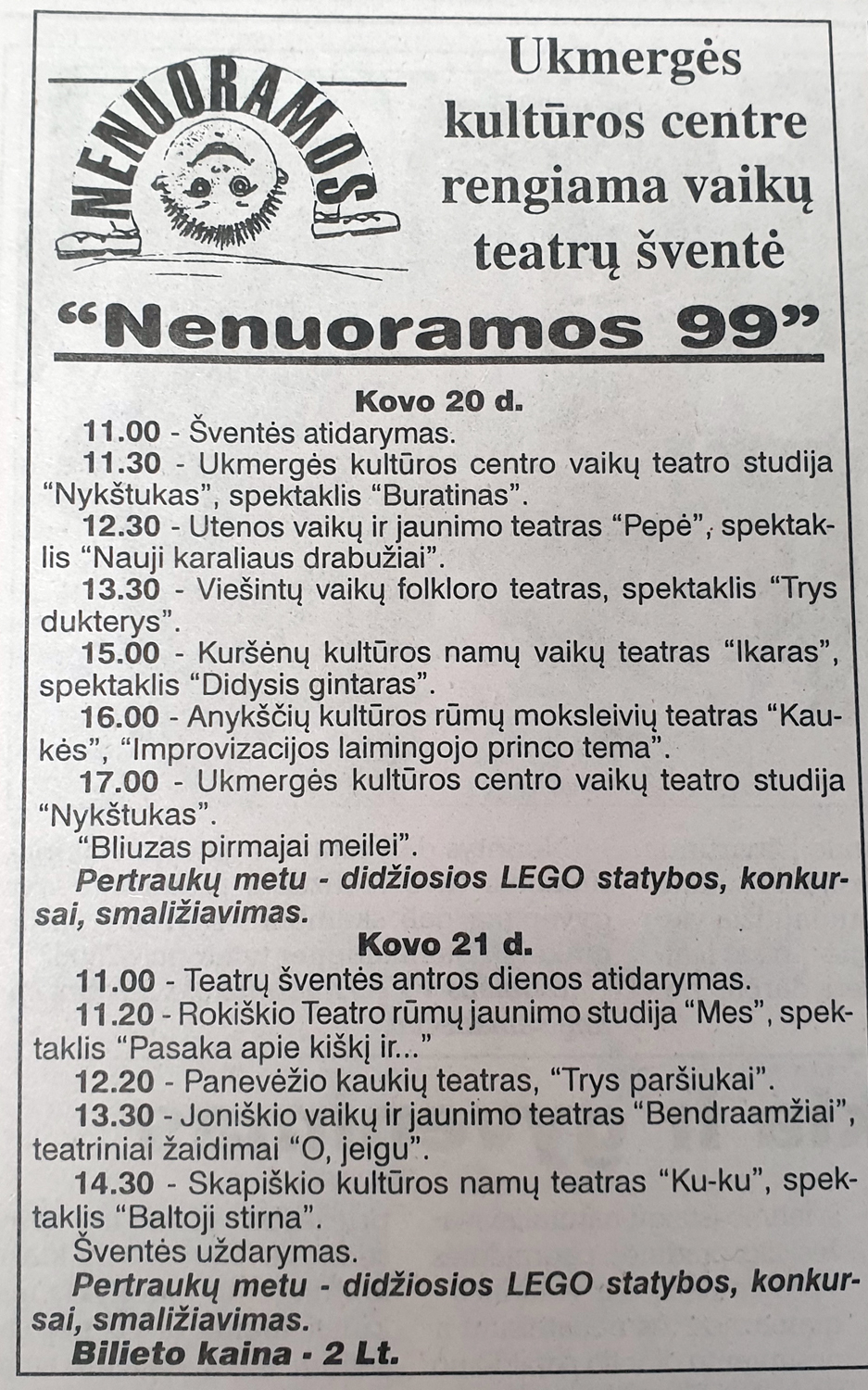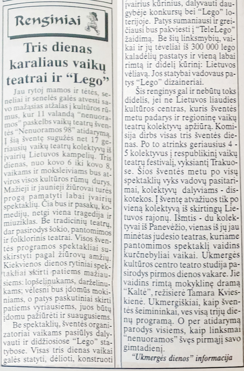Kitame laikraštyje taip pat skelbta apie itin įvairią šventės programą: „Čia bus ir pasakų, komedijų, netgi viena tragedija ir miuziklas. Be tradicinių teatrų dar pasirodys šokio, pantomimos ir folklorinis teatrai.“ Ukmergiškiai ne tik rodė spektaklį, bet ir vedė visų trijų dienų programą. Organizatoriai skyrė daug dėmesio žiūrovams. Publikacijoje rašoma, kad spektakliai suskirstyti pagal žiūrovų amžių: kasdien rytiniai spektakliai buvo skirti mažiausiems vaikams (ikimokyklinukams), dieniniai – didesniems vaikams (mokiniams), vėlesni – jaunimui. Publikacijoje paaiškina, kodėl organizuotas toks didelis renginys. Lietuvos liaudies kultūros centras šventės metu rengė ir regioninę vaikų teatrų apžiūrą, kurios metu penki kolektyvai turėjo būti atrinkti dalyvauti respublikiniame festivalyje. Po spektaklių vyko vadovų pasitarimai (Tris dienas karaliaus vaikų teatrai ir Lego, Ukmergės diena, 1998-03-05, Nr. 26).