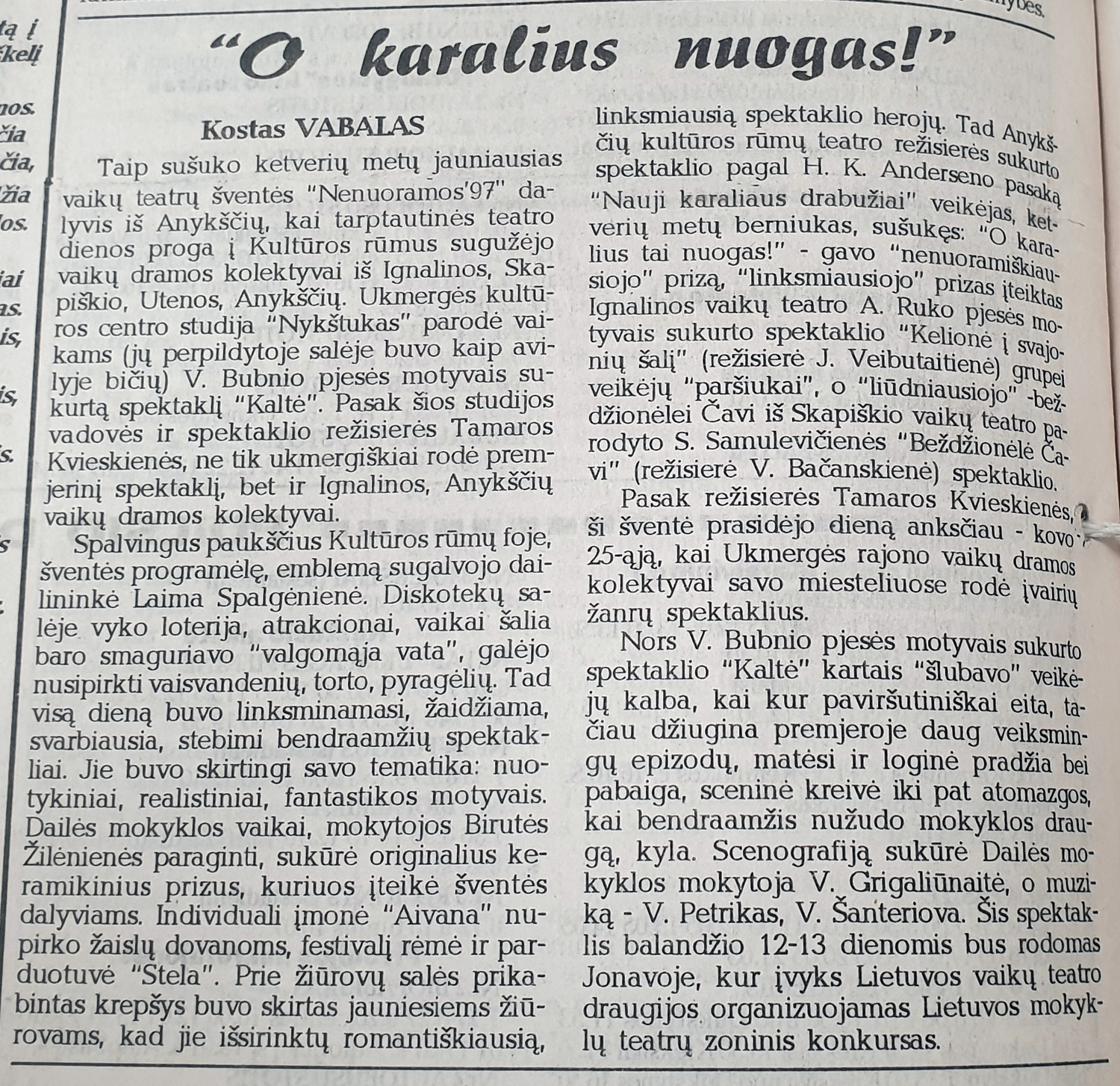 „Nykštukas“ šventėje parodė V. Bubnio pjesės motyvais sukurto spektaklio „Kaltė“ premjerą. Premjeras atvežė ir Anykščiai bei Ignalina. Pažymima, kad spektakliai buvo skirtingi tematika: „nuotykiniai, realistiniai, fantastikos motyvais“ (Vabalas Kostas. „O karalius nuogas!“, Gimtoji žemė, 1997-04-05, Nr. 38). Žiūrovai rinko romantiškiausią, linksmiausią, liūdniausią ir „nenuoramiškiausią“ spektaklių herojus.