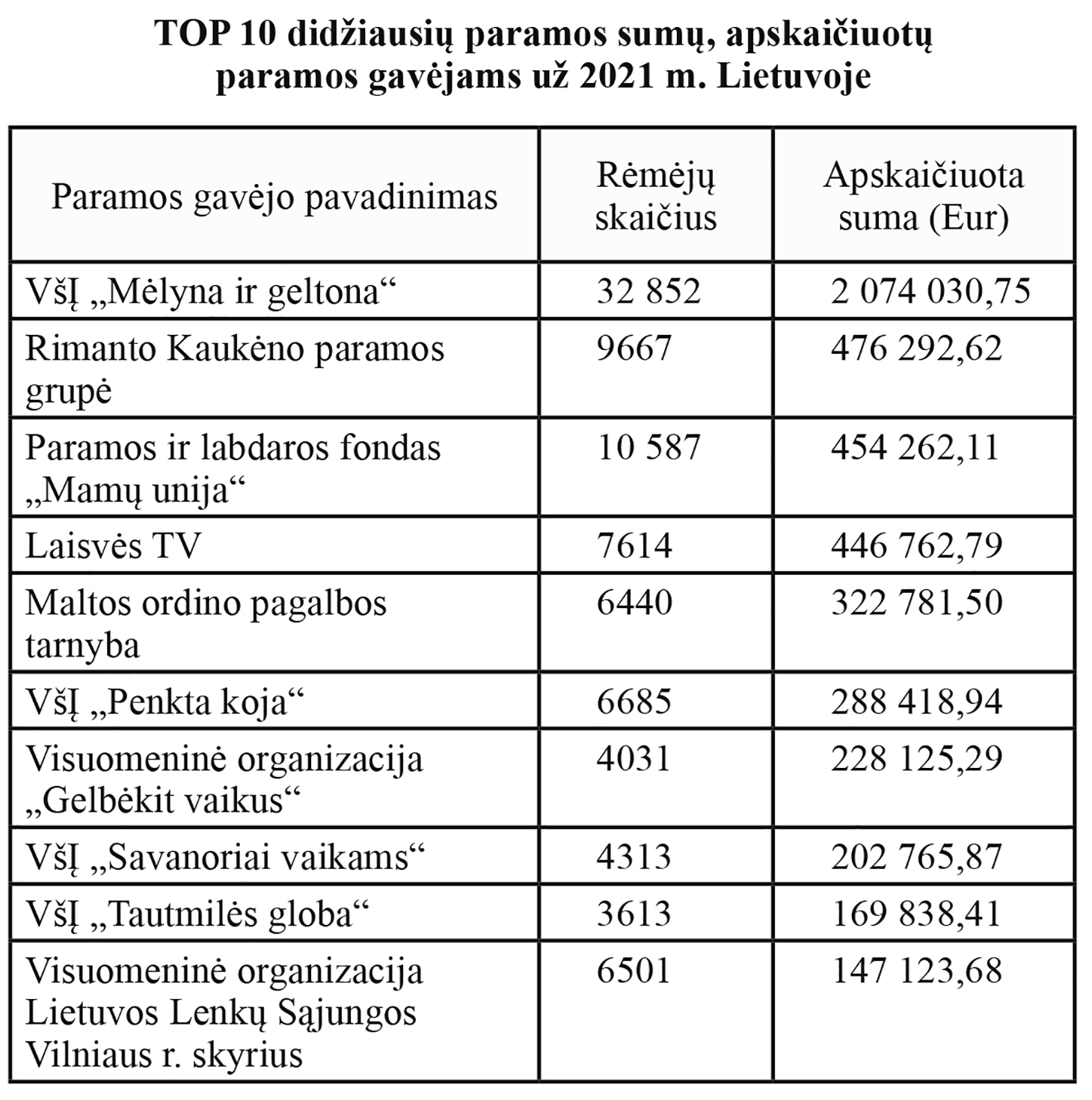 Valstybinė mokesčių inspekcija informuoja, kad paramos gavėjams Lietuvoje pervesta visa už 2021 m. skirta gyventojų pajamų mokesčio (GPM) paramai dalis.