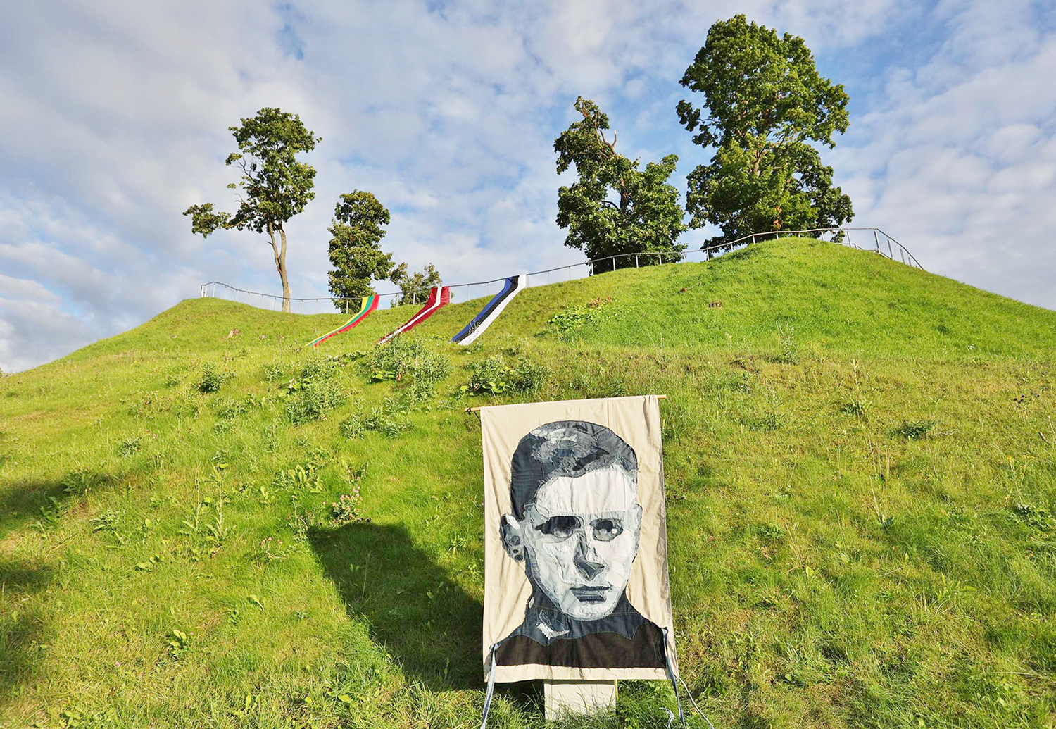 Piliakalnio papėdę puošė buvusios ukmergiškės Mildos Paukštės iš medžiaginių skiaučių sukurtas poeto V. Mačernio portretas.