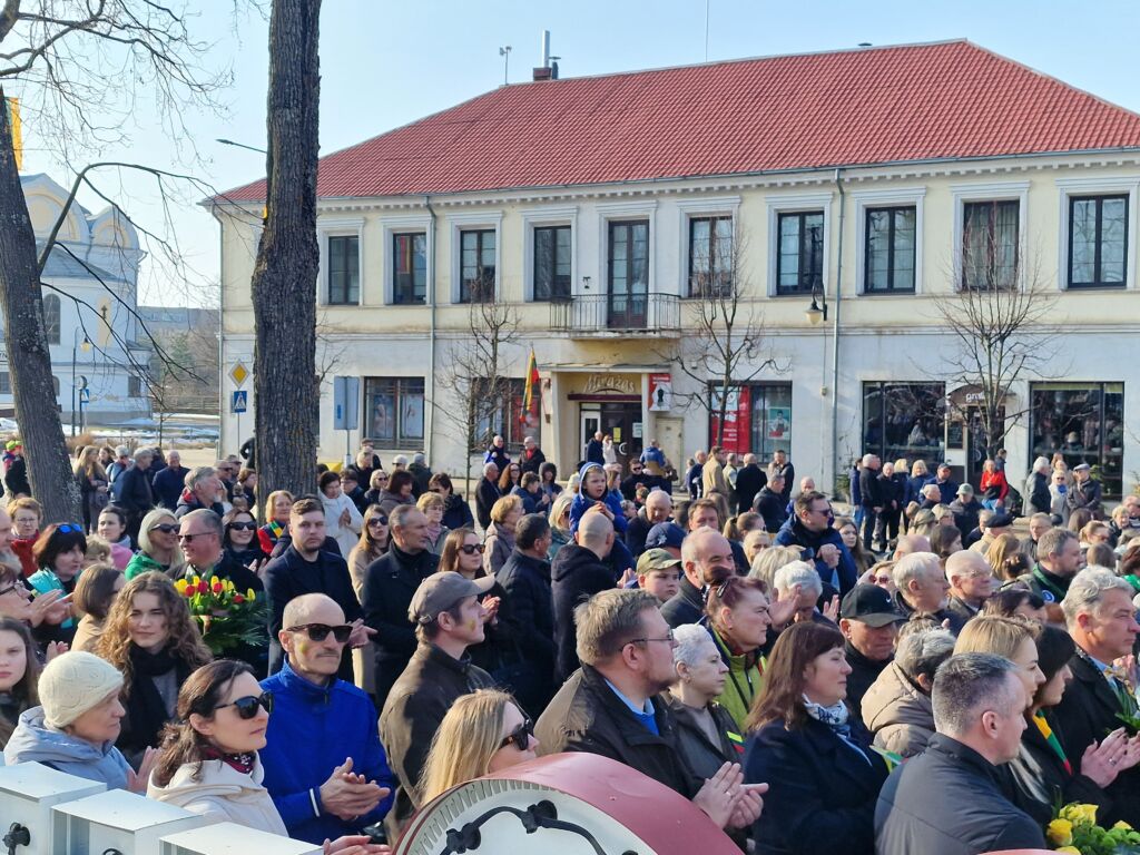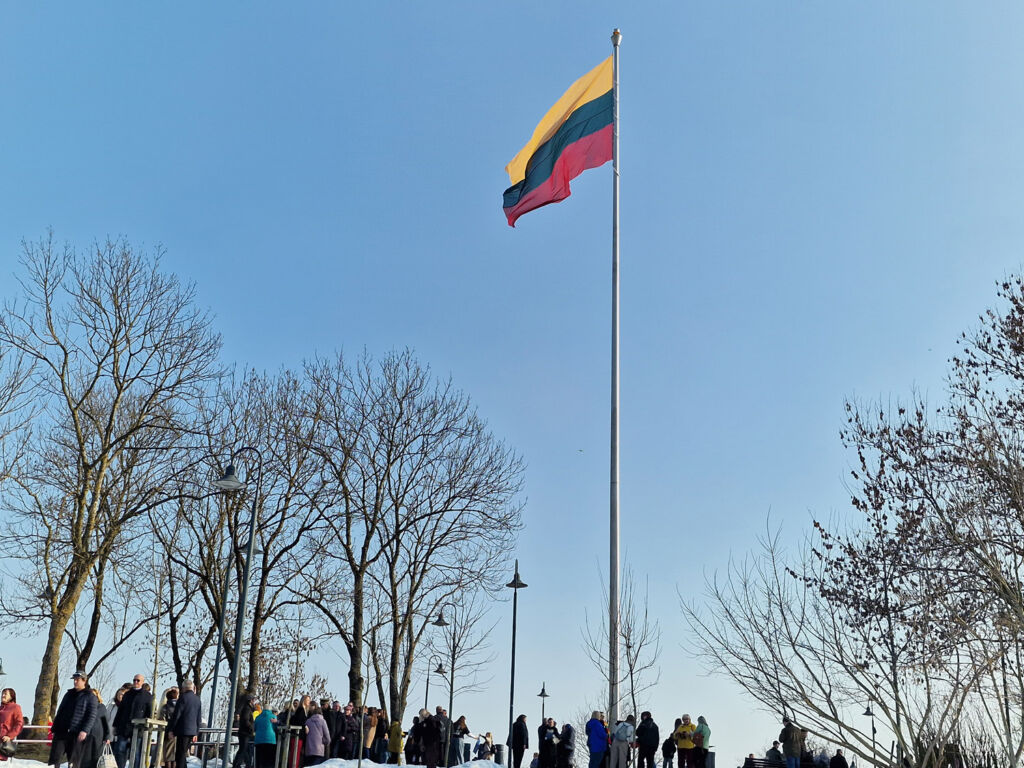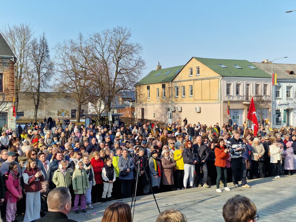 Kol vėliava buvo nešama, prie Laisvės paminklo skambėjo sveikinimai Kovo 11-osios proga ir dainos.