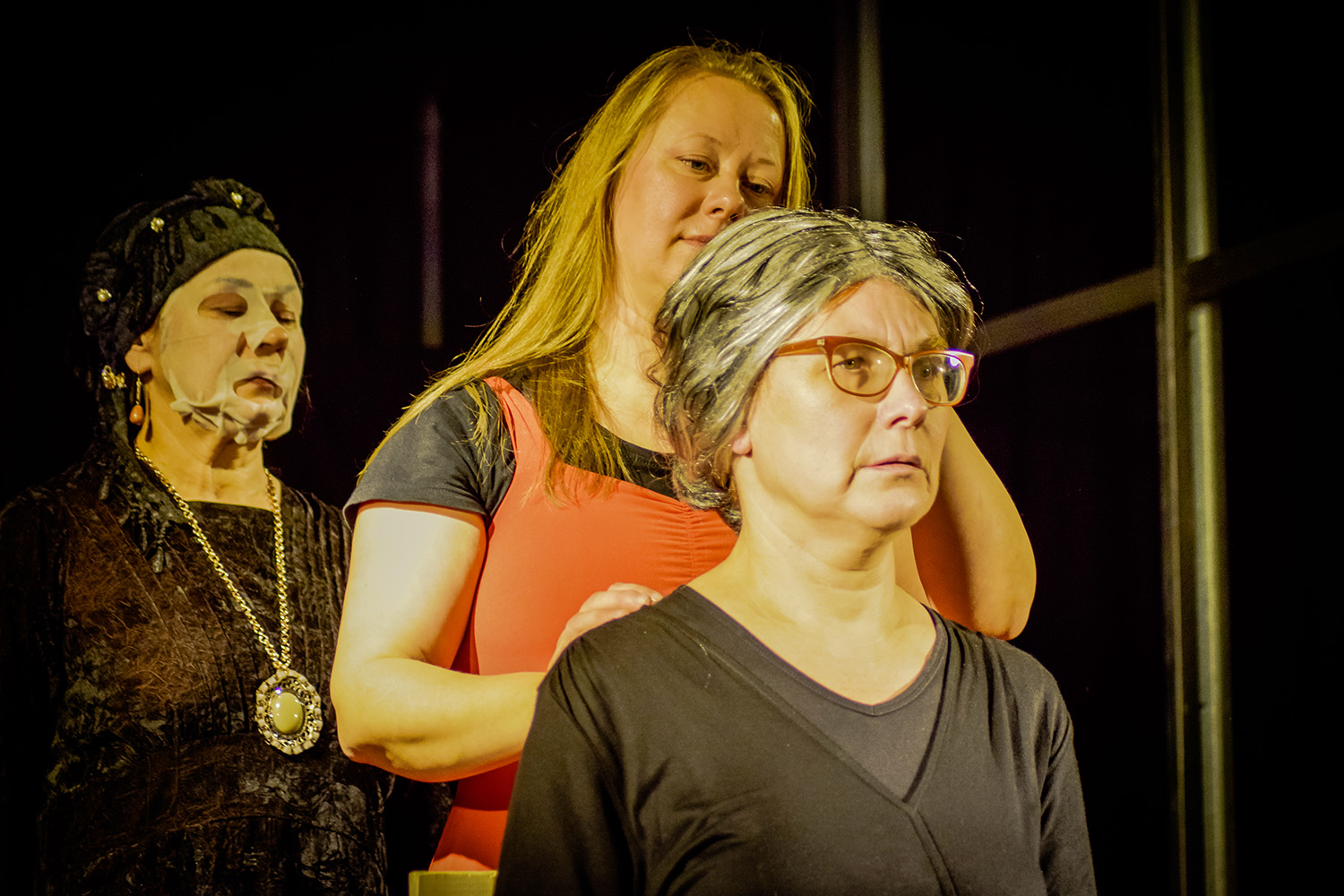 Savitai pjesę teatro scenoje interpretavo režisierė S. Vasiliauskaitė-Dančenkovienė. Pastatyme atsisakyta buitiškumo, realistinio detalių vaizdavimo, kalbama per simbolius, kuriuos reikia skaityti. Spalvos, scenografija, rekvizitas, judesiai koduoja tai, kas nepasakoma tekstu, lieka tarp eilučių. Metalas, stiklas, medis, virvės – scenoje tik tai, kas tikra, gryna, tarsi apnuoginta.