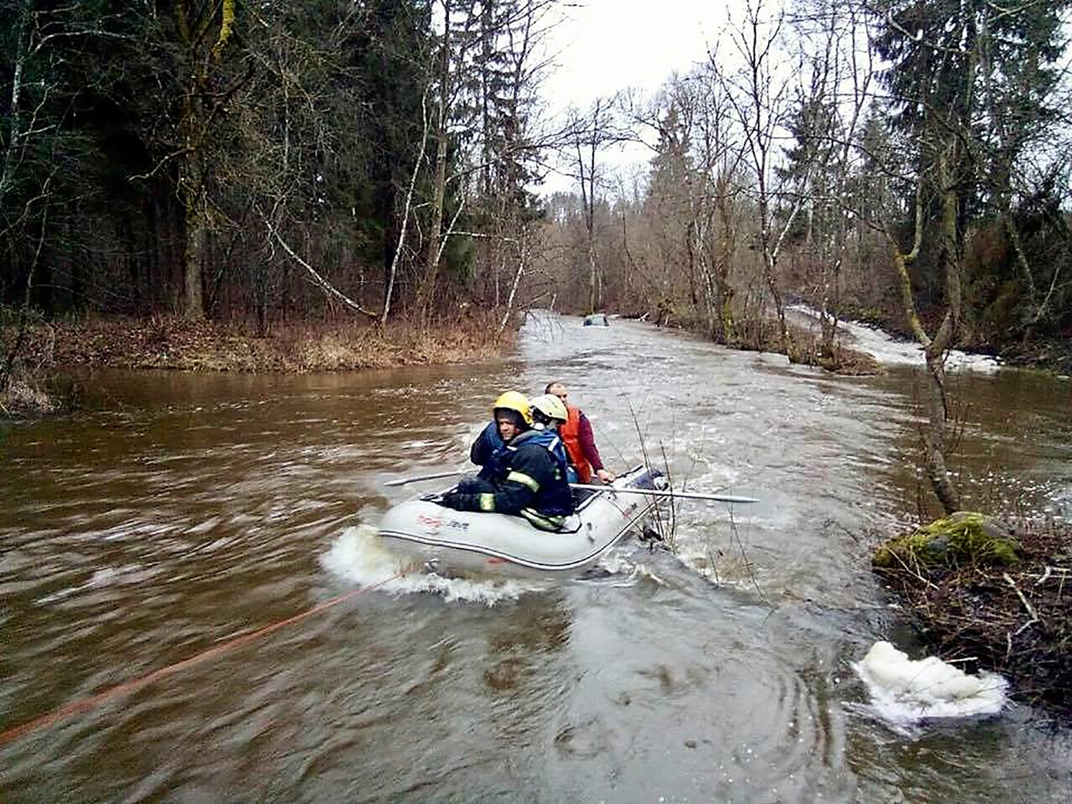 Įvykio koordinatės praneštos gaisrininkams ir medikams. Privažiuoti arčiau dėl patvinusio upelio buvo neįmanoma. Apie 7 val. Ukmergės priešgaisrinės gelbėjimo tarnybos gelbėtojai nelaimėlius perkėlė į krantą ir nugabeno į ligoninės priėmimo skyrių.