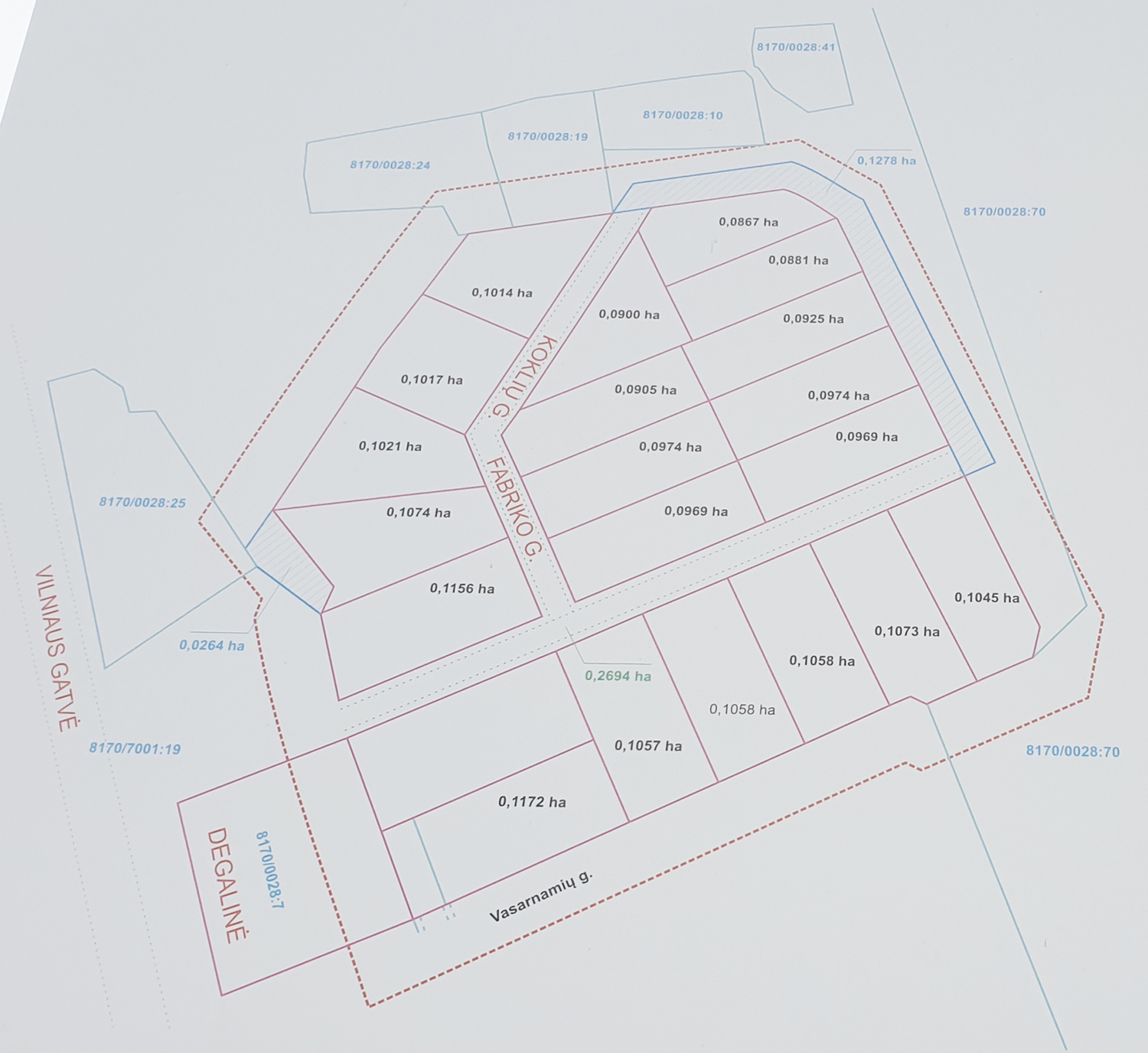 Sklypo savininkas Saulius Vilutis informavo, kad bendras teritorijos plotas – 2,5 ha namų valda. Jame suformuota dešimt sklypų, kurių plotai nuo 14 iki 21 aro. Likusiame plote numatyta įrengti žaliąsias zonas, servitutinius kelius.