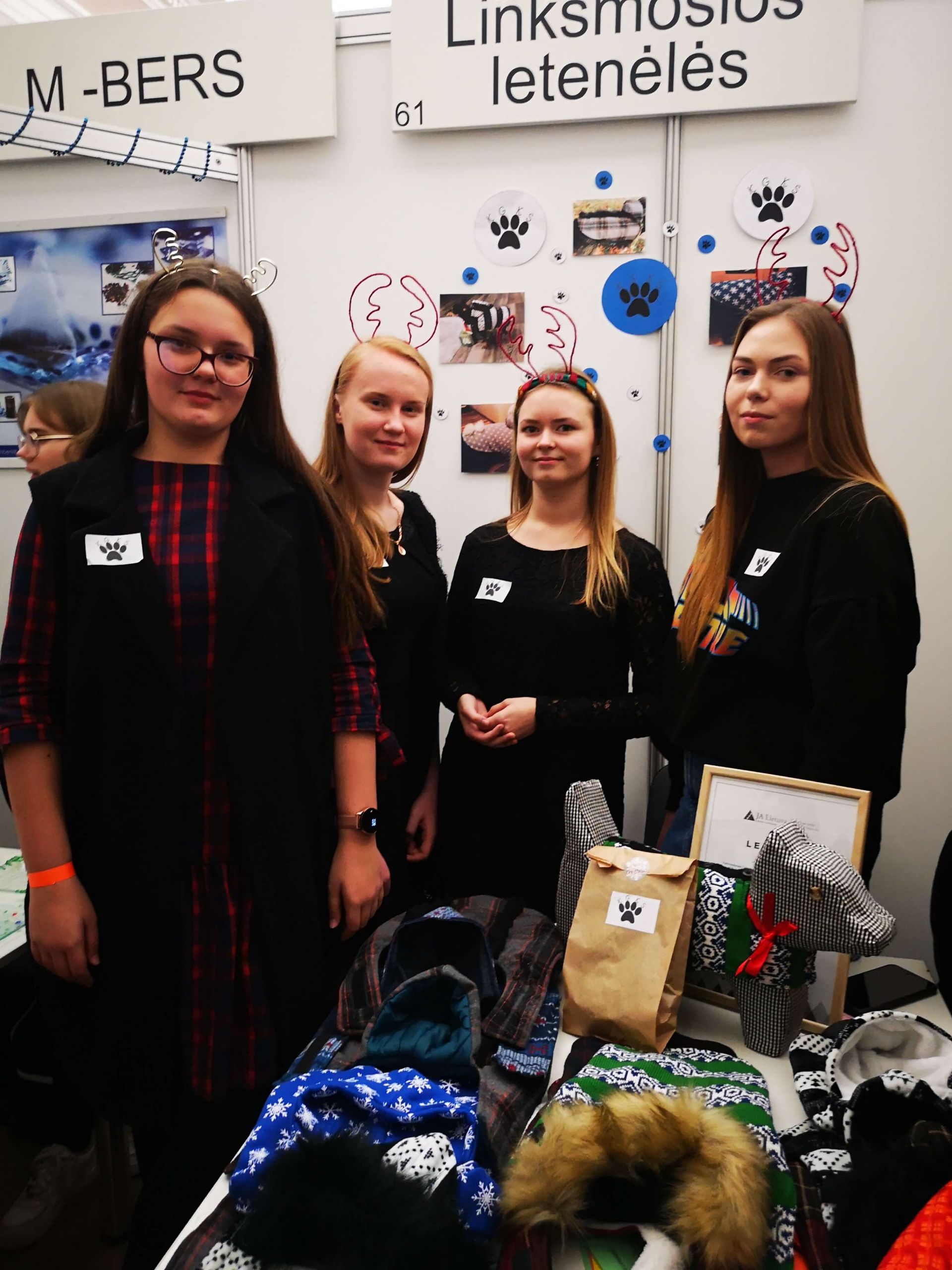 „Gimnazistų sukurta bendrovė „Linksmosios letenėlės“ mugėje pristatė savo verslo idėją – mokiniai kuria ir siuva iš padėvėtų drabužių vienetinius rankų darbo drabužius, kurie skirti augintiniams. Iš šio verslo siekiama ne tik pelno, bet ir kuriamas socialinės atsakomybės modelis – nuo gauto pelno dalis pajamų atiteks beglobių augintinių organizacijai.