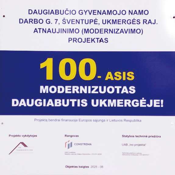 2025 m. birželio mėn. įgyvendintas 100-asis renovacijos projektas – atnaujintas (modernizuotas) daugiabutis gyvenamasis namas Darbo g. 7, Šventupės k., Ukmergės r., pasiekta pastato energinio naudingumo „B“ klasė, šiluminės energijos sąnaudos po namo renovacijos sumažėjo 67,32 procento. Gyventojai džiaugiasi, kad sumažėjo šildymo sąskaitos, namas tapo modernesnis ne tik vidumi, bet ir išore – balkonus įstiklinus per visą namo aukštį fasadas atrodo labai šiuolaikiškas. Norime padėkoti renovacijos procesuose dalyvavusiai aktyviai, susitelkusiai namo bendruomenei. Sunkumų susitarti tarpusavyje kaimynams nekilo, gyventojai ne tik pritarė namo renovacijai, bet ir viso proceso metu ją kantriai palaikė, suprasdami, kad tai ilgalaikė investicija į kokybiškesnį gyvenimą. Dėkojame statybos darbus vykdžiusiam rangovui UAB „Constrema“, kurio darbuotojai stengėsi atlikti darbus kokybiškai, laiku, iškilusius klausimus operatyviai spręsti su gyventojais ir su administratoriumi UAB Ukmergės butų ūkiu. Džiugu stebėti kaip kasmet gražėja ir modernėja Šventupės gyvenvietė, jau renovuoti daugiabučiai Darbo g. 1, Darbo g. 5, Darbo g. 7, A.Vienuolio g. 6, jų pavyzdžiu seka ir renovacijos darbams ruošiasi Darbo g. 3, Darbo g. 9, Darbo g. 11, A.Vienuolio g. 8 namai.
