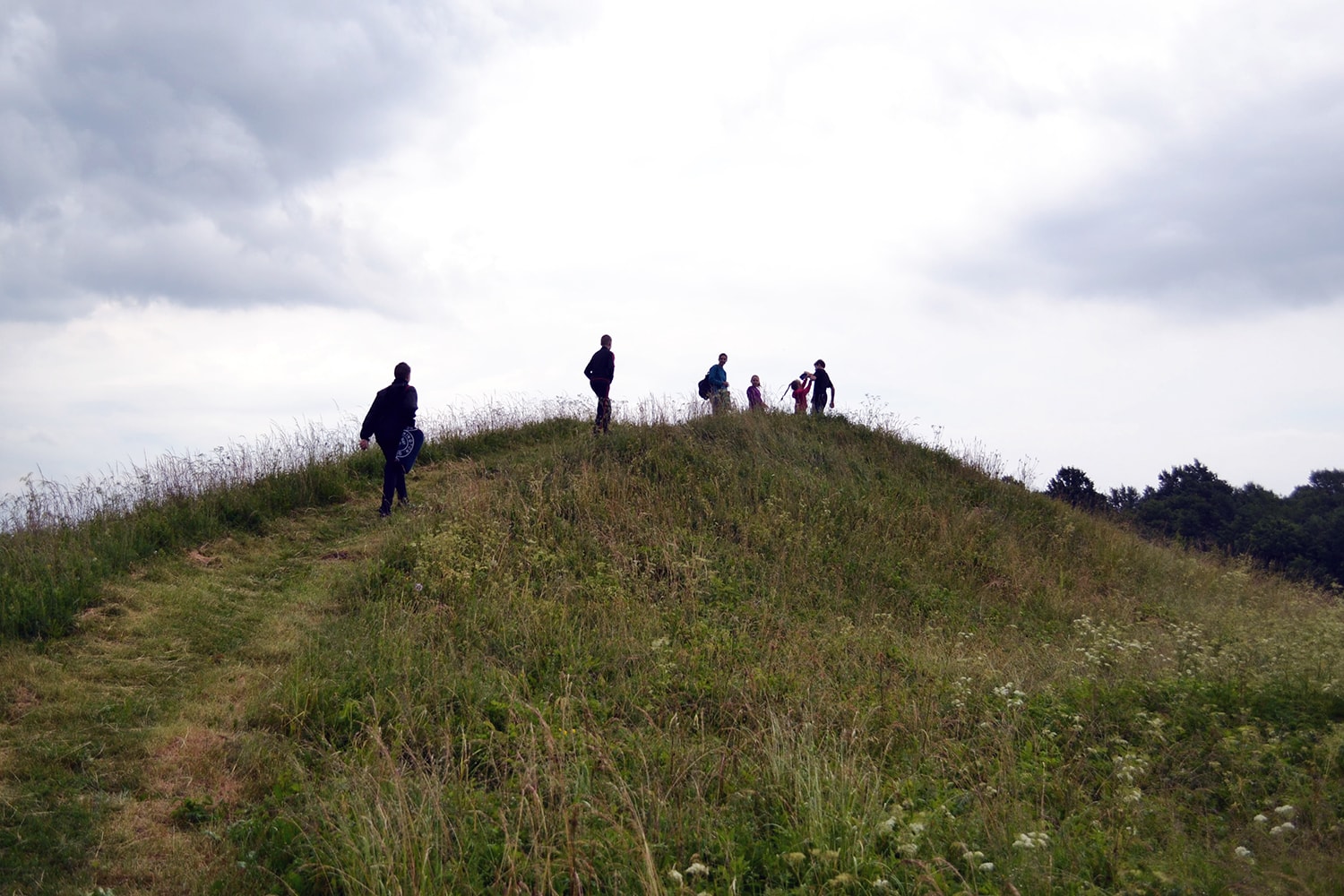 Moteris parodė, kuria kryptimi eiti, ir papasakojo, kas mūsų laukia… Pirmiausia įveikėme pievą, kur žolės buvo aukštesnės net už žygyje dalyvavusias mergaites. Įžengę į tankų mišką, įveikėme nuvirtusius medžius, krūmynus ir galiausiai pamatėme piliakalnį. Tiksliau – tik jo likusį vieną šlaitą prie senosios upės vagos.